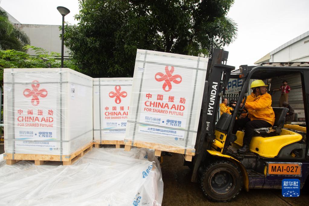 9月9日,在緬甸仰光國際機場,工作人員搬運中國援助的新冠疫苗。