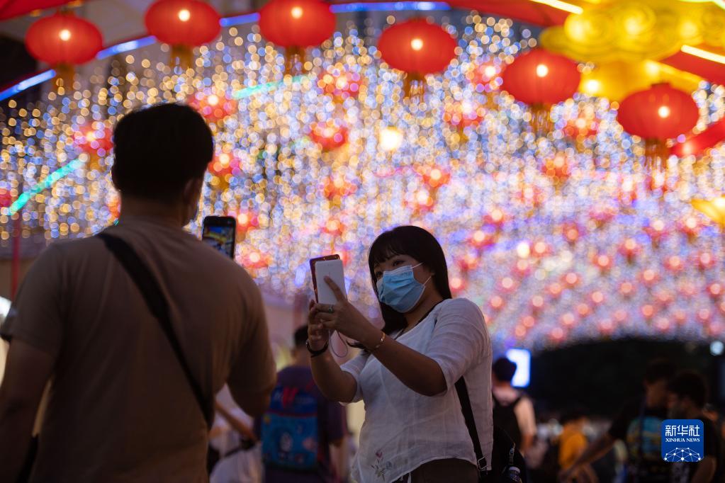 9月10日,人們在澳門議事亭前地觀賞燈飾。新華社記者 張金加 攝