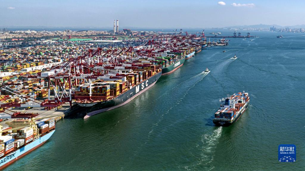 山東港口青島港前灣三期集裝箱碼頭,11個泊位全線開工,5條300米以上大船一字排開(9月10日攝,無人機照片)。