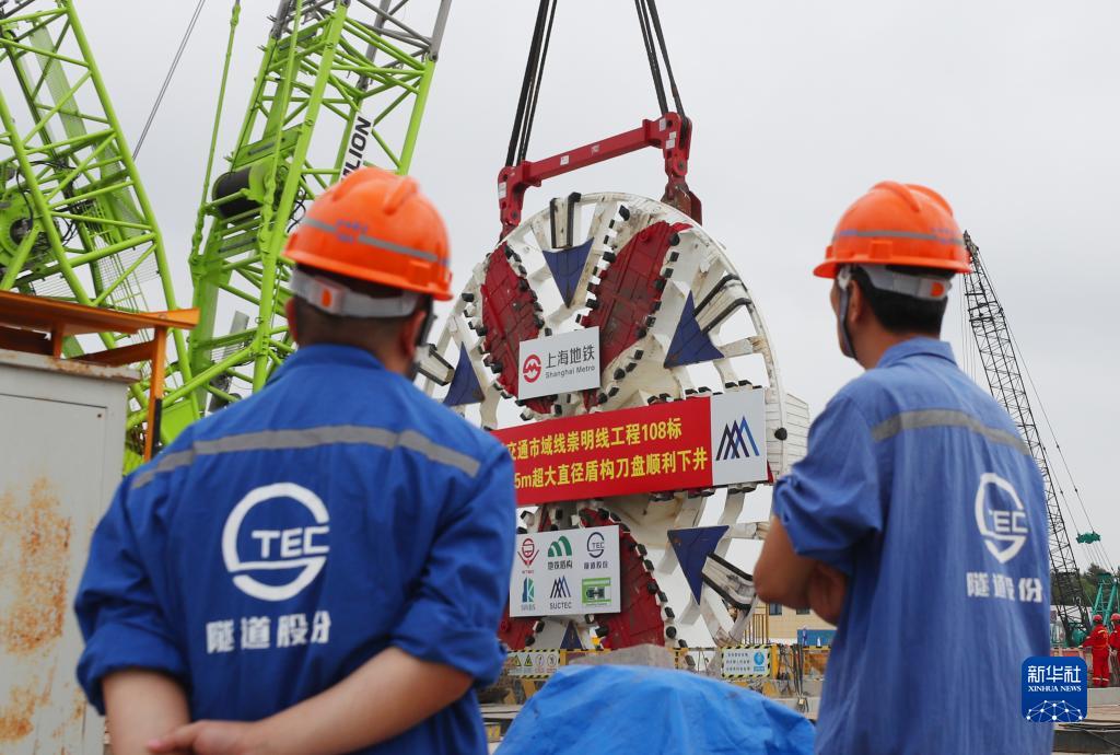 9月12日,施工人員在觀看“申通號(hào)”盾構(gòu)機(jī)刀盤(pán)吊裝下井作業(yè)施工。