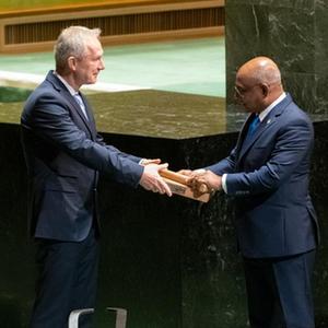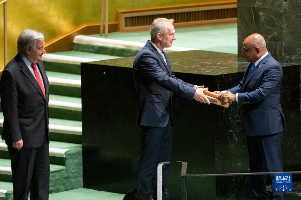 9月12日,在位于紐約的聯合國總部,第77屆聯合國大會主席克勒希(中)從上屆聯大主席沙希德(右)手中接過象征聯大主席權力的木槌。