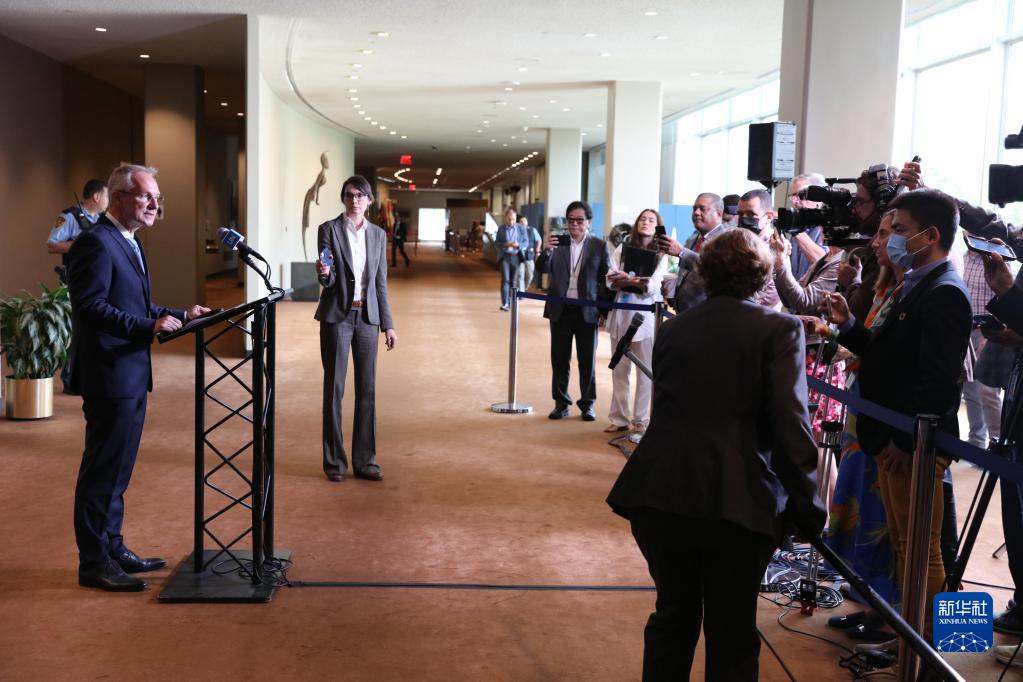 9月12日,在位于紐約的聯(lián)合國總部,匈牙利外交官克勒希(前左)宣誓就任第77屆聯(lián)大主席后出席記者會(huì)。