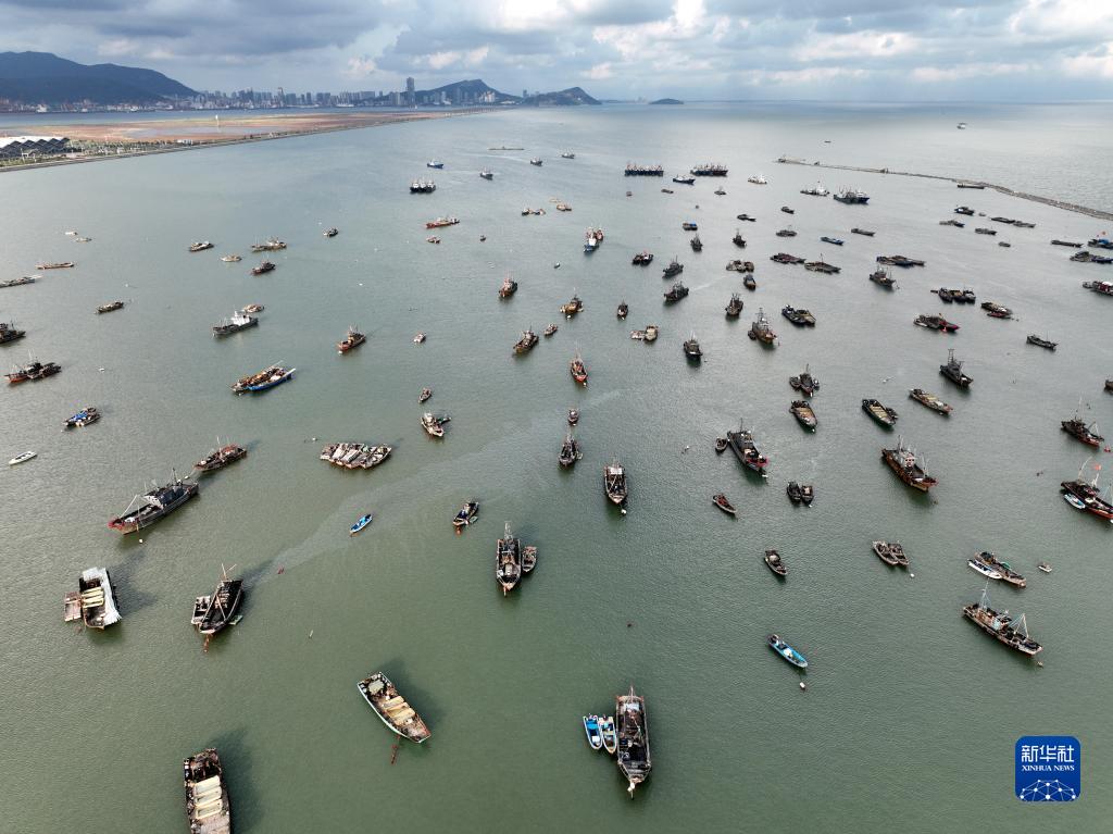 9月13日,漁船停泊在江蘇省連云港市連島中心漁港碼頭港灣躲避臺風(無人機照片)。