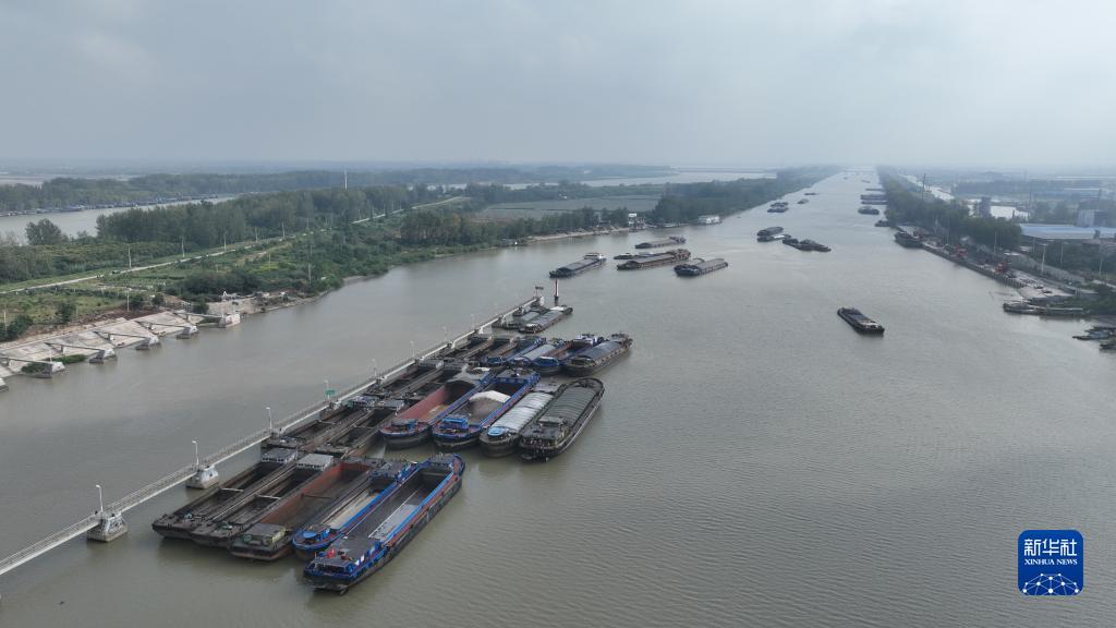9月13日,船只停泊在江蘇省淮安市蘇北灌溉總渠內(nèi)避風(fēng)(無人機(jī)照片)。
