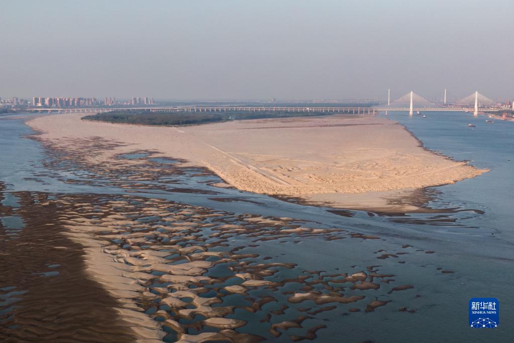 近日,長江武漢段水位持續消退,大片灘涂露出江面,天興洲北岸幾乎與漢口江岸連成一片。截至9月13日22時,長江漢口站水位為13.58米,較歷史同期均值偏低逾8米。