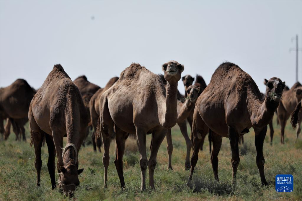 這是8月13日在哈薩克斯坦南部城市圖爾克斯坦拍攝的與哈薩克斯坦金駱駝集團有限公司開展合作的駱駝養殖戶的駱駝群。新華社發(奧斯帕諾夫 攝)