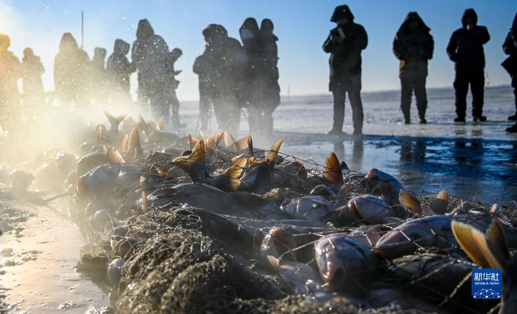 游客在查干湖冰面上近距離觀看冬捕盛況(2021年12月26日攝)。新華社記者 顏麟蘊 攝