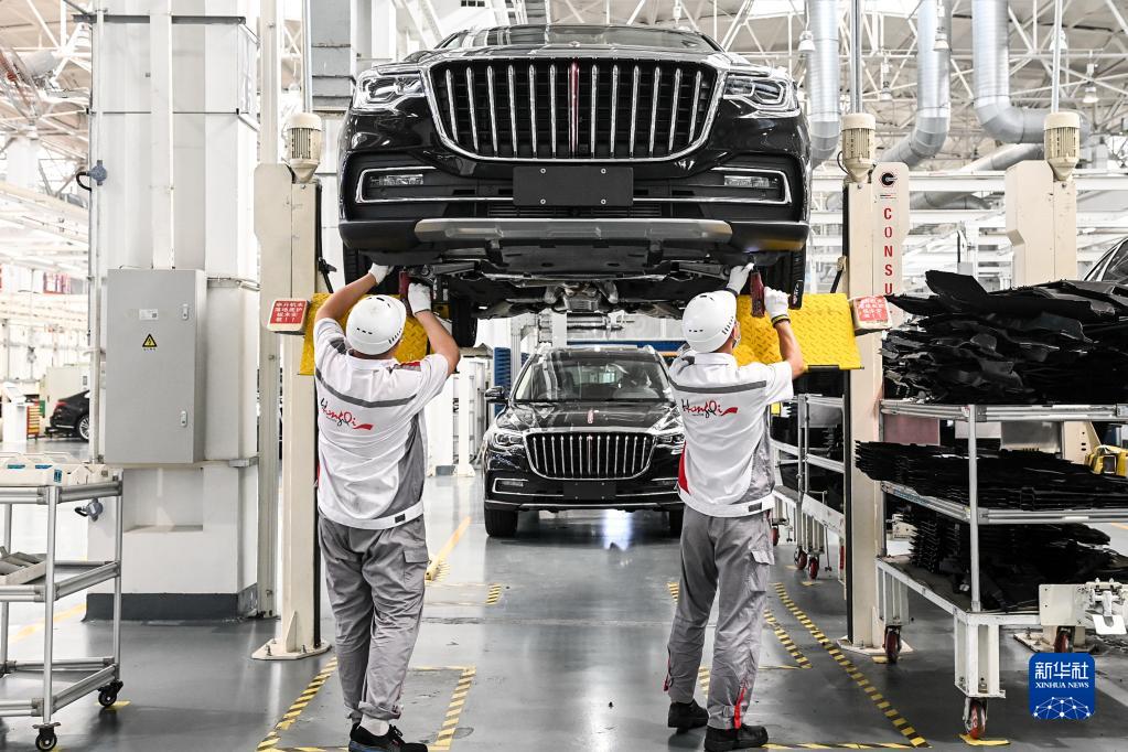 工人在位于吉林長春的一汽紅旗工廠總裝車間內裝配車輛(2021年7月1日攝)。新華社記者 顏麟蘊 攝