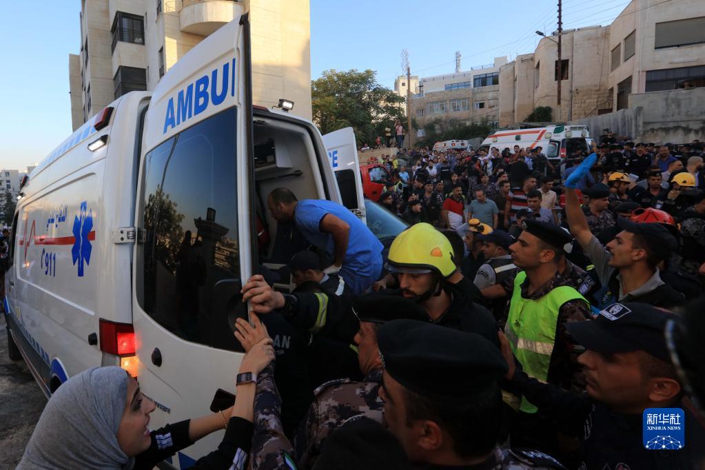 9月13日,在約旦首都安曼的居民樓倒塌事故現場,救援人員將傷者轉移到救護車上。