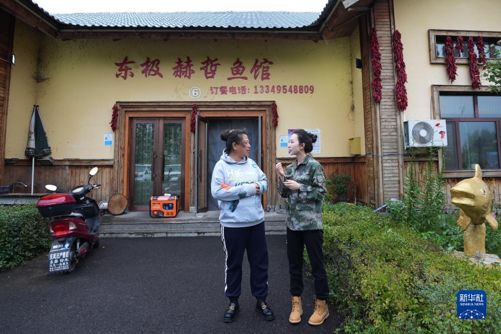 9月7日,尚美含(右)與抓吉赫哲族村的村干部商量第二天的活動事項。