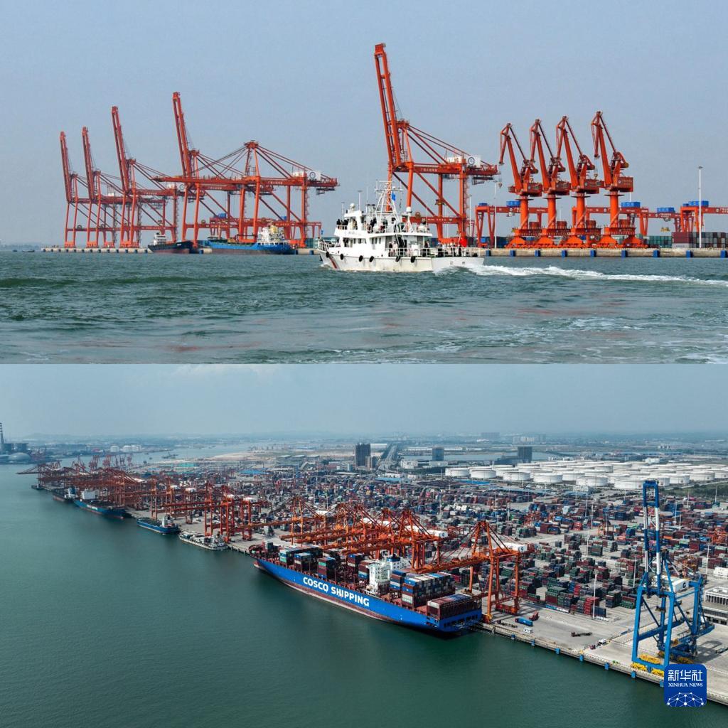 拼版照片:上圖為2010年的欽州港碼頭作業(yè)區(qū) (2010年11月29日攝);下圖為2022年的欽州港碼頭作業(yè)區(qū)(2022年8月28日攝,無人機(jī)照片)。