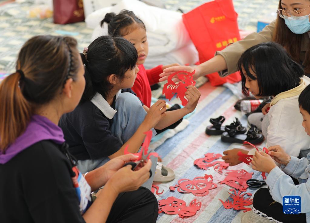 9月14日,在石棉縣王崗坪鄉(xiāng),老師在國(guó)家能源集團(tuán)大渡河大崗山公司提供的場(chǎng)地教學(xué)生剪紙。