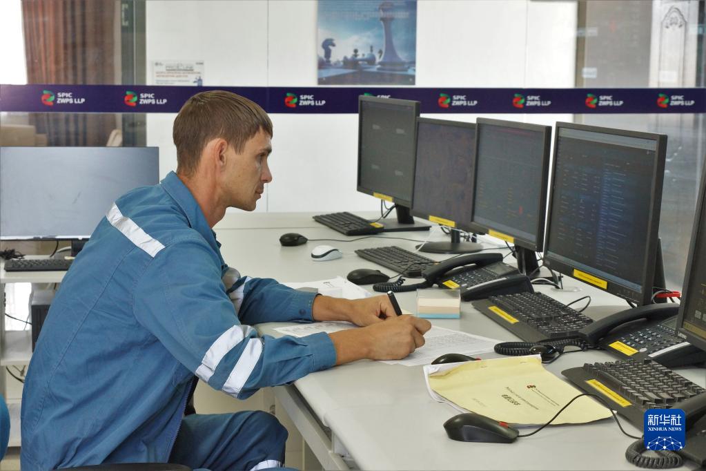 9月13日,哈薩克斯坦札納塔斯風電場控制中心員工監控風機的運行。