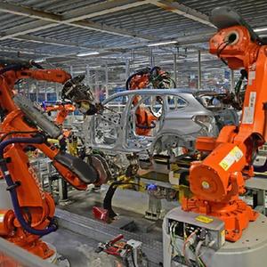 2022年2月16日,在華晨寶馬沈陽鐵西工廠車身車間,機器臂在焊接車身。新華社記者 楊青 攝