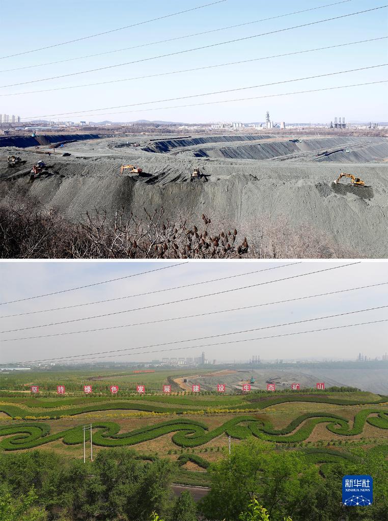 這是一張拼版照片:上圖為遼寧省撫順市西露天礦部分區域生態恢復前的場景(2019年3月6日攝,資料照片);下圖為2022年6月2日拍攝的遼寧省撫順市西露天礦部分區域生態恢復后的場景(新華社記者楊青攝,無人機照片)。新華社發