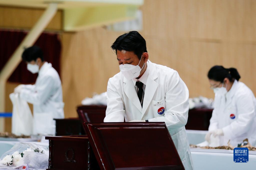 9月15日,在韓國仁川,韓方工作人員將志愿軍烈士遺骸入殮。