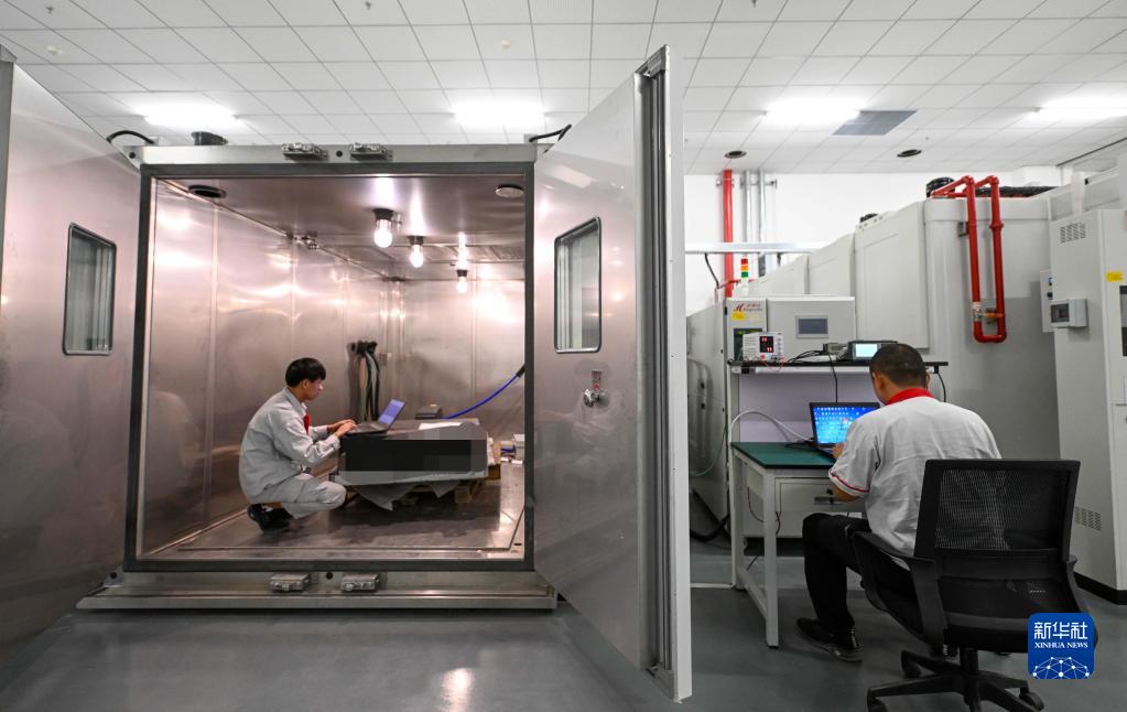 9月14日,在中汽中心新能源汽車科技創(chuàng)新基地能源系統(tǒng)部,工作人員準(zhǔn)備某商用車動(dòng)力電池組環(huán)境適應(yīng)性試驗(yàn)。