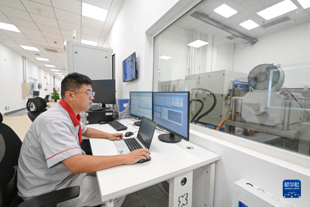 9月14日,在中汽中心新能源汽車科技創新基地電驅電控部,工作人員進行電動汽車用高性能電驅動總成測試。