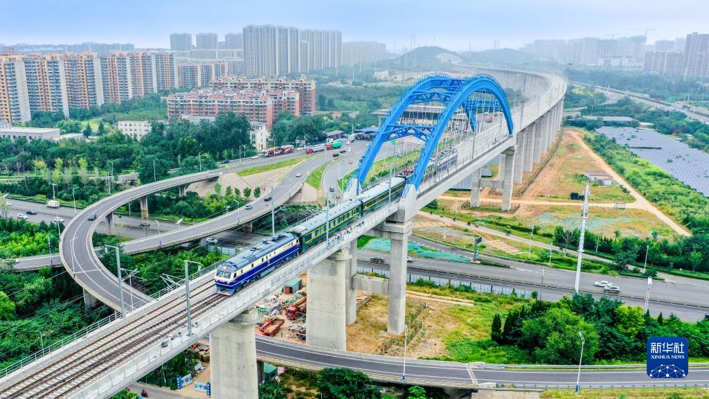 9月15日,檢測列車駛過濟萊高鐵歷城站特大橋(無人機照片)。