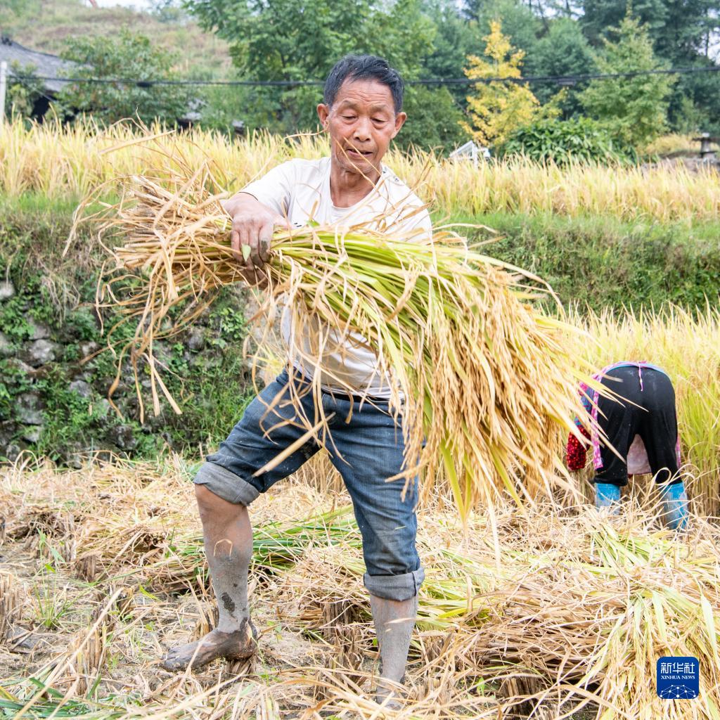 9月14日,在重慶市酉陽土家族苗族自治縣花田鄉(xiāng),稻農(nóng)在稻田里搶收稻谷。 新華社記者 唐奕 攝