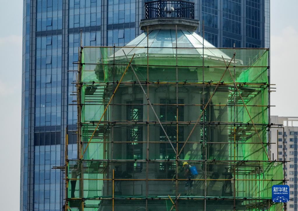 9月15日,工人們?cè)趯?duì)湖北武漢江漢關(guān)鐘樓進(jìn)行保護(hù)修繕(無人機(jī)照片)。