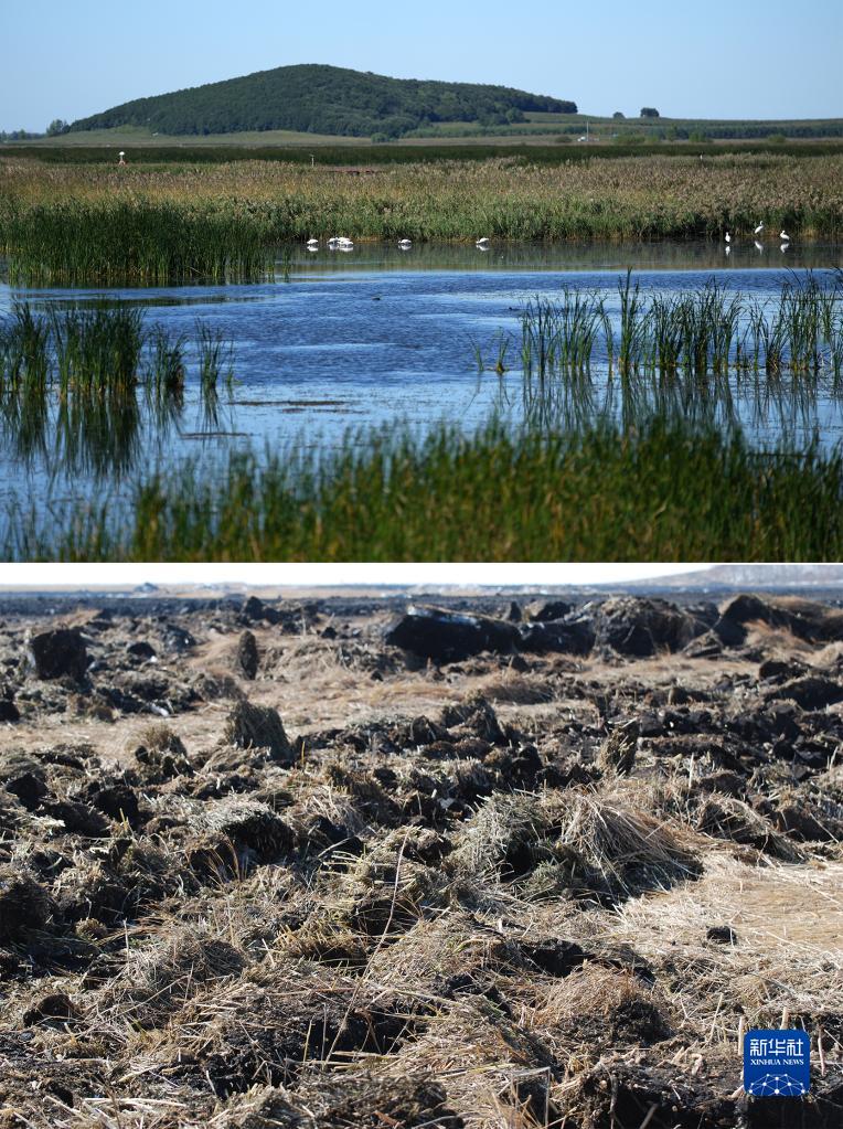 拼版照片:上圖是9月9日拍攝的富錦國家濕地公園局部(新華社記者王建威攝);下圖是2005年之前被破壞的黑魚泡保護區,富錦國家濕地公園是后來在保護區基礎上建立起來的(資料照片)。