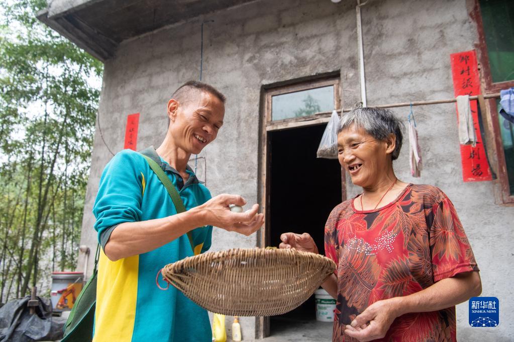 9月15日,投遞員張永洪(左)在村民家收取村民外銷的農產品。
