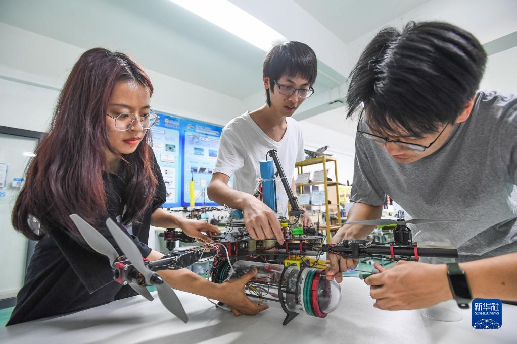 廣東工業大學學生團隊在“工大創谷”研發空水兩棲遠程巡檢平臺(9月14日攝)。