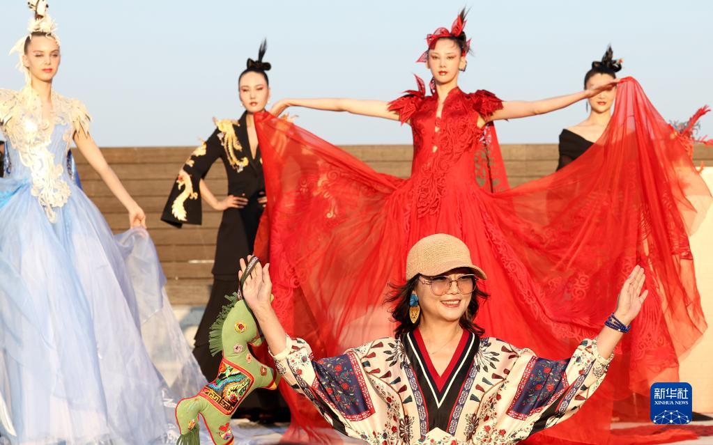 9月16日,知名時(shí)裝設(shè)計(jì)師劉薇(前)和模特在2022北京時(shí)裝周“劉薇非遺作品大賞”時(shí)裝秀上謝幕。