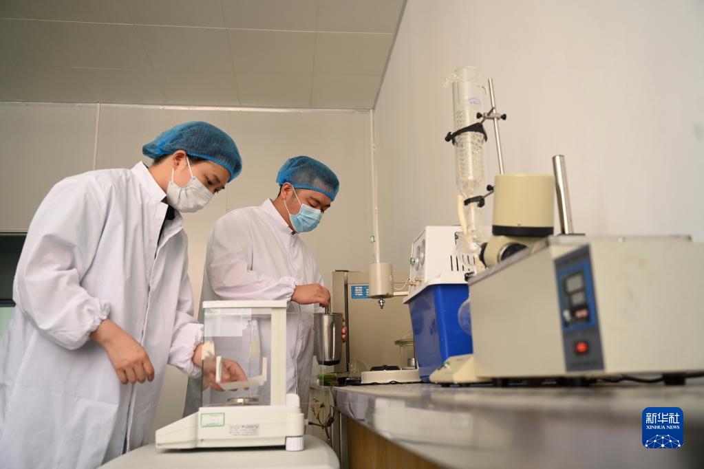 9月16日,林俊杰(右)在閩侯縣祥謙鎮中院村的扁肉拌面生產車間的實驗室對拌面進行抽樣檢驗。