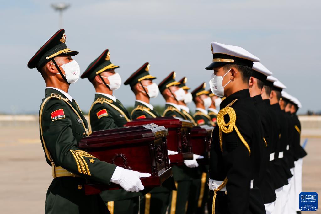 9月16日,在韓國仁川國際機場,中國人民解放軍禮兵(左)從韓方接過中國人民志愿軍烈士棺槨。