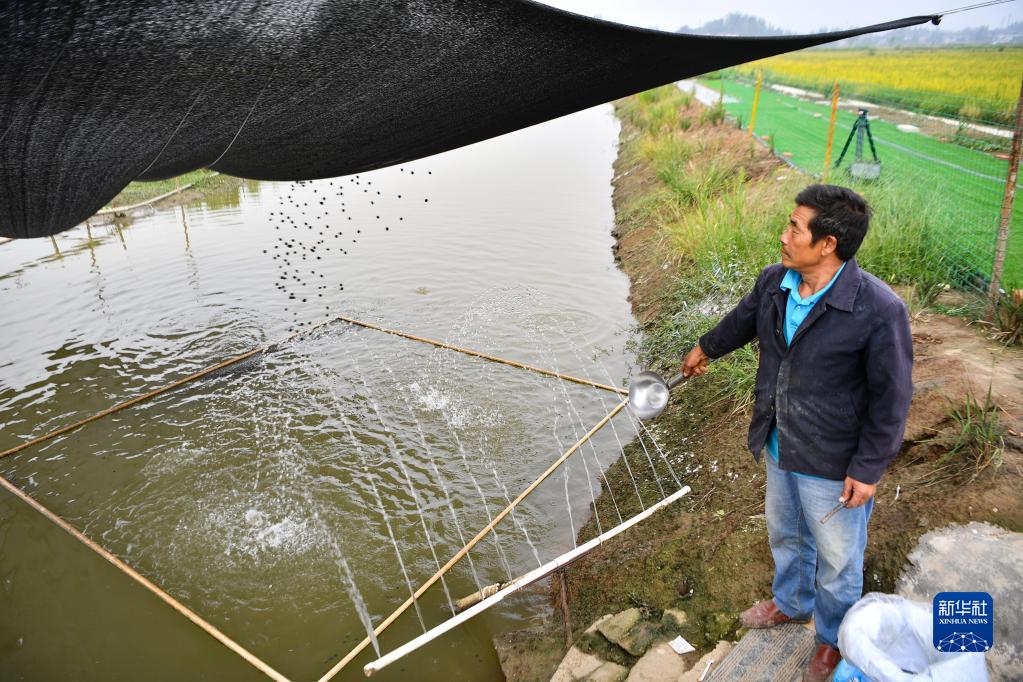 9月15日,養殖人員在漢中市洋縣馬暢鎮一處稻漁綜合種養基地向飼養的鱸魚投食。