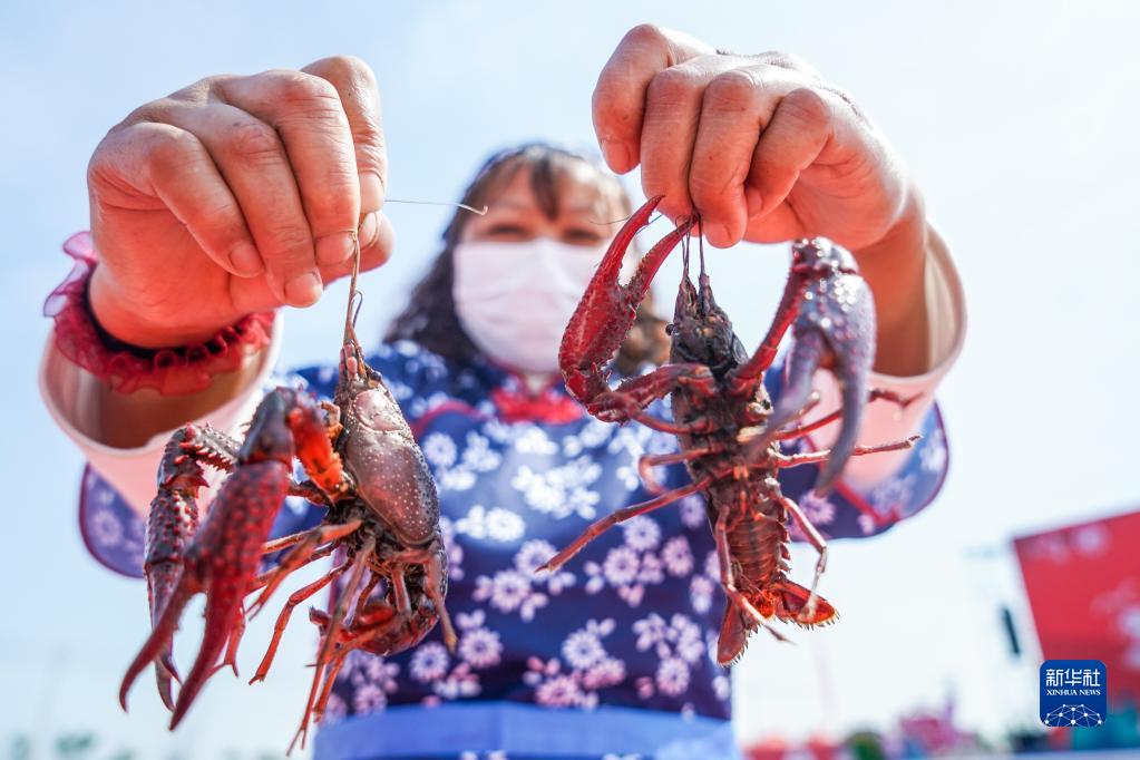 在江蘇省淮安市盱眙縣舉行的第22屆中國·盱眙國際龍蝦節開捕儀式活動現場,農業工人展示小龍蝦(2022年5月18日攝)。