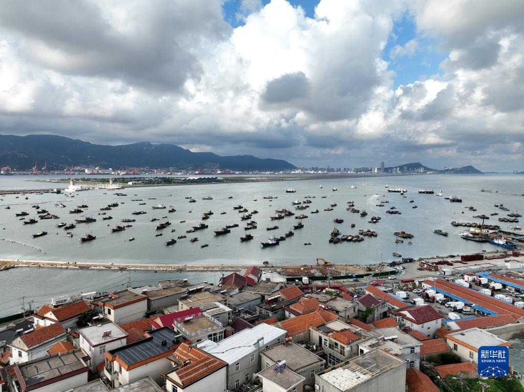 漁船停泊在江蘇省連云港市連島中心漁港碼頭港灣躲避臺風“梅花”(9月13日攝,無人機照片)。