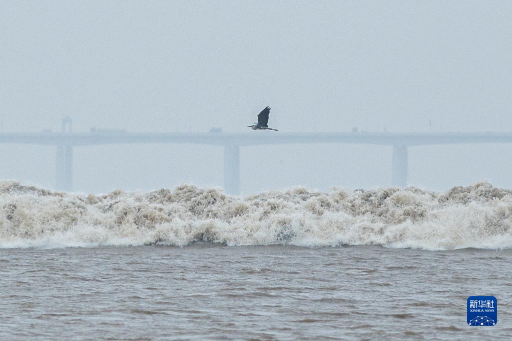一只水鳥在錢塘江潮水上空飛舞(9月13日攝)。今年,受臺風“梅花”影響,錢塘江在風雨之中迎來大潮。