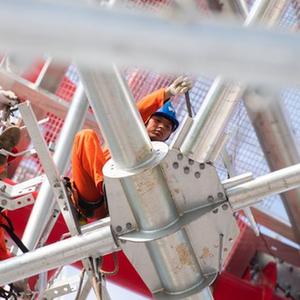 9月18日,在位于湖南省岳陽(yáng)市臨湘市的南荊長(zhǎng)特高壓工程螺山長(zhǎng)江大跨越施工現(xiàn)場(chǎng),國(guó)網(wǎng)山東送變電工程有限公司工作人員調(diào)整間隔棒(無人機(jī)照片)。