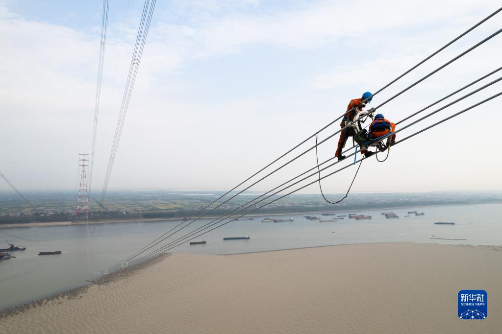 9月18日,在位于湖南省岳陽市臨湘市的南荊長特高壓工程螺山長江大跨越施工現場,國網山東送變電工程有限公司的工作人員調整間隔棒(無人機照片)。