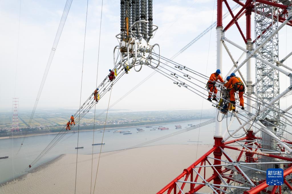 9月18日,在位于湖南省岳陽市臨湘市的南荊長特高壓工程螺山長江大跨越施工現(xiàn)場,國網(wǎng)山東送變電工程有限公司的工作人員安裝阻尼線(無人機照片)。