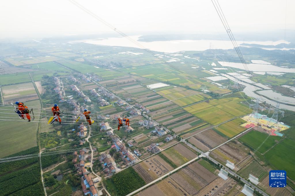 9月18日,在位于湖南省岳陽市臨湘市的南荊長特高壓工程螺山長江大跨越施工現場,國網山東送變電工程有限公司的工作人員安裝阻尼線(無人機照片)。