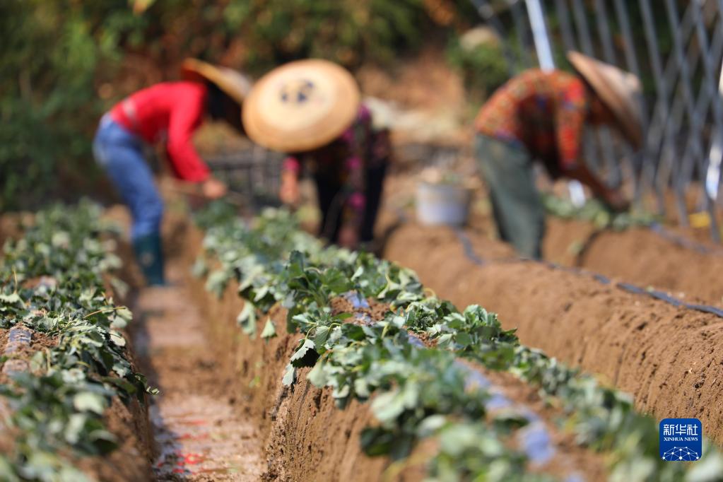 9月18日,湖南省湘西土家族苗族自治州吉首市石家沖街道寨陽村村民在移栽草莓苗。