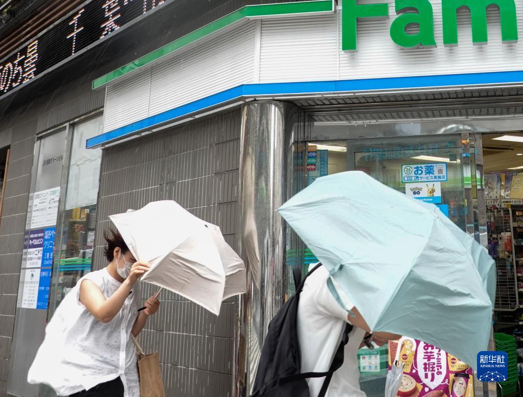 9月19日,行人在日本東京街頭冒雨前行。