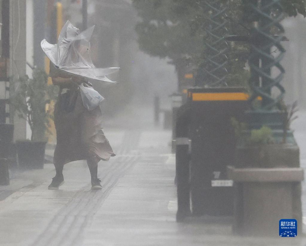 9月18日,行人在日本宮崎縣宮崎市街頭冒雨前行。