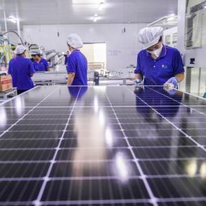 9月17日,山東省東營(yíng)經(jīng)濟(jì)技術(shù)開發(fā)區(qū)潤(rùn)馬光能科技有限公司工人在生產(chǎn)太陽能電池板。