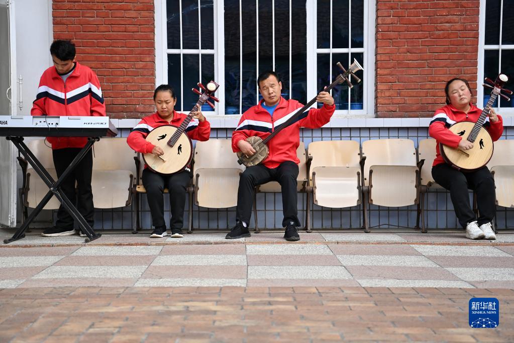 陵川縣盲人曲藝宣傳隊隊員在院子里練習樂器(9月15日攝)。