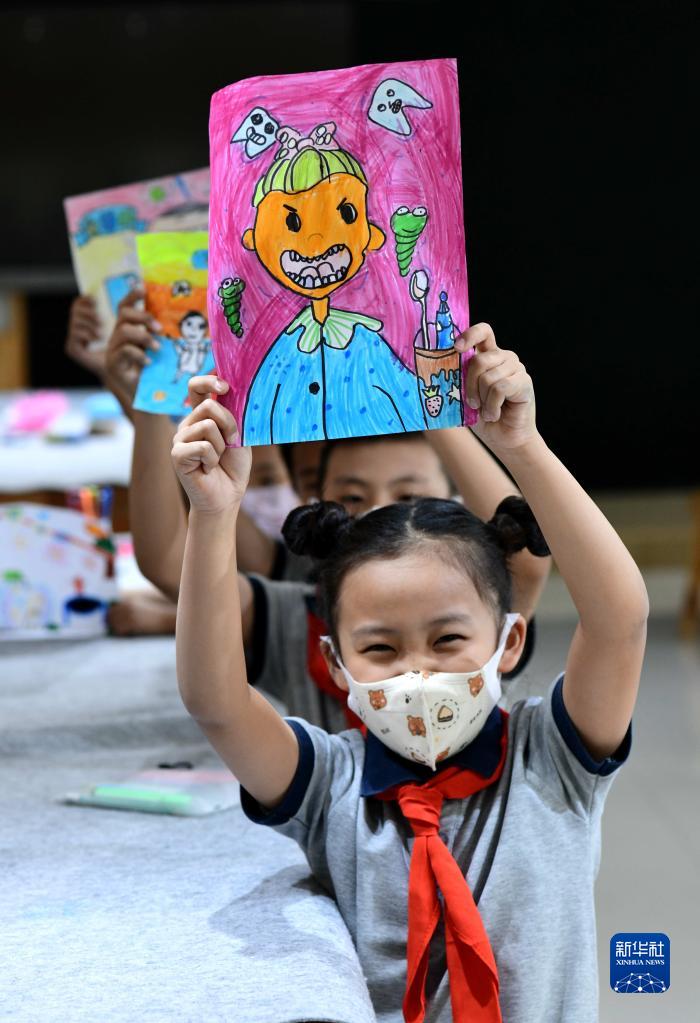 9月19日,在河北省石家莊市西古城小學,孩子們在展示迎接愛牙日主題繪畫作品。