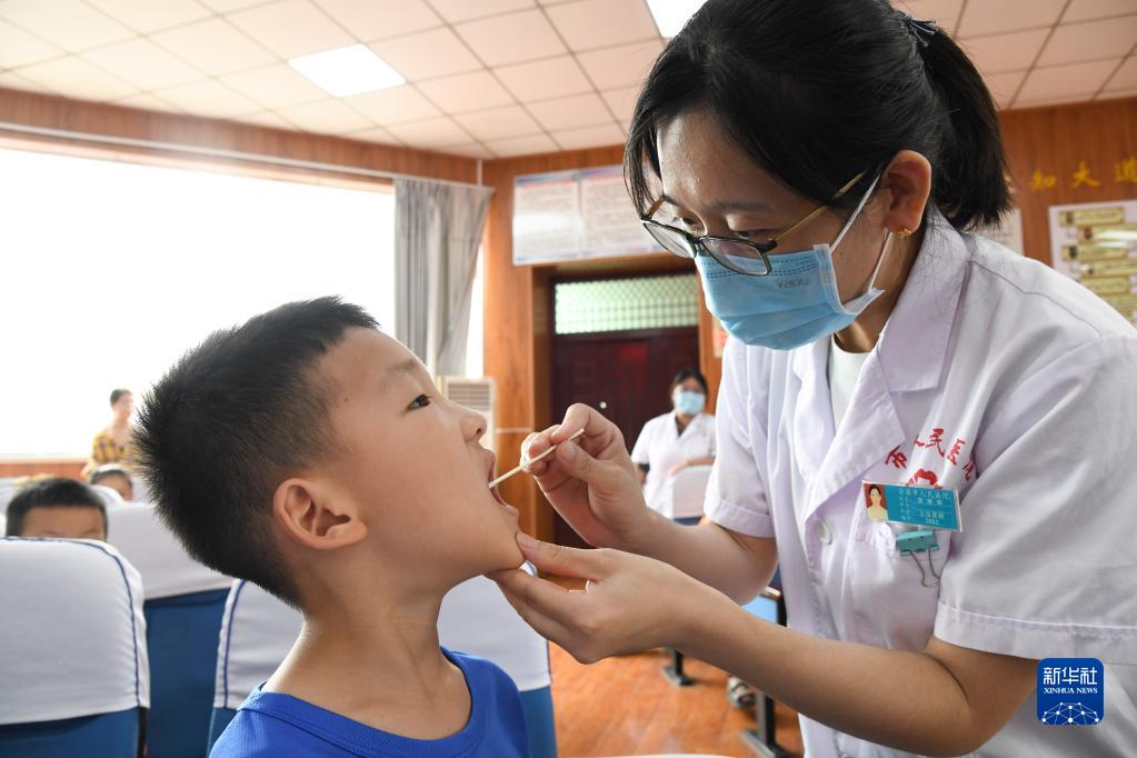 9月19日,在河南省濟源市濟水東園學校,濟源市人民醫院口腔科醫生為小學生檢查口腔健康狀況。