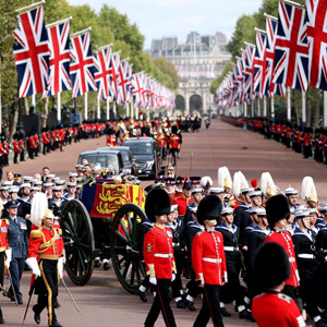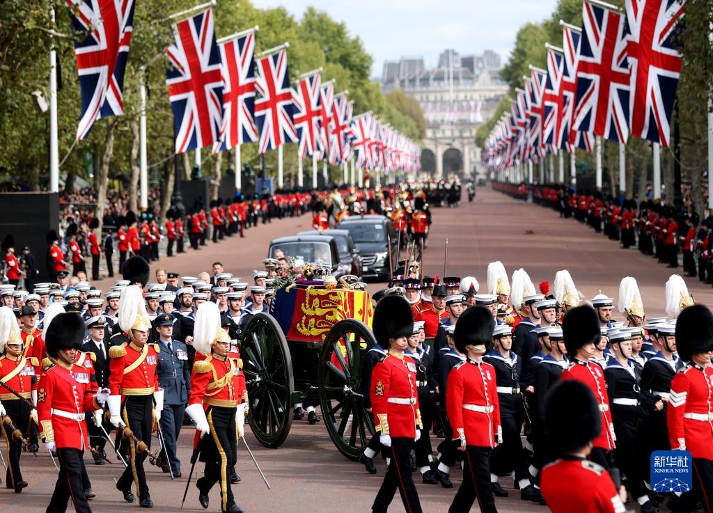 9月19日,在英國倫敦,載有英國女王伊麗莎白二世靈柩的靈車從白金漢宮附近經過。