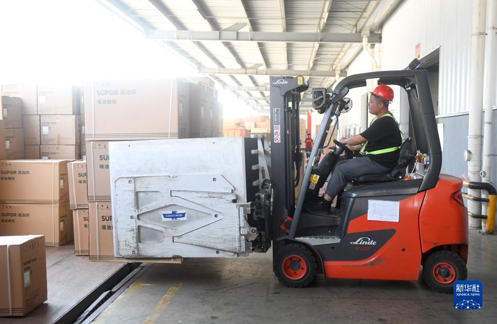 工作人員在位于廣州市開發(fā)區(qū)的京東倉庫里搬運快遞包裹(9月15日攝)。