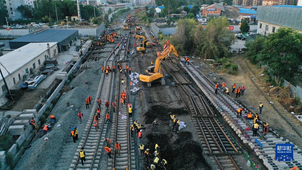 9月19日拍攝的遼寧朝陽南站站改封鎖施工現場(無人機照片)。