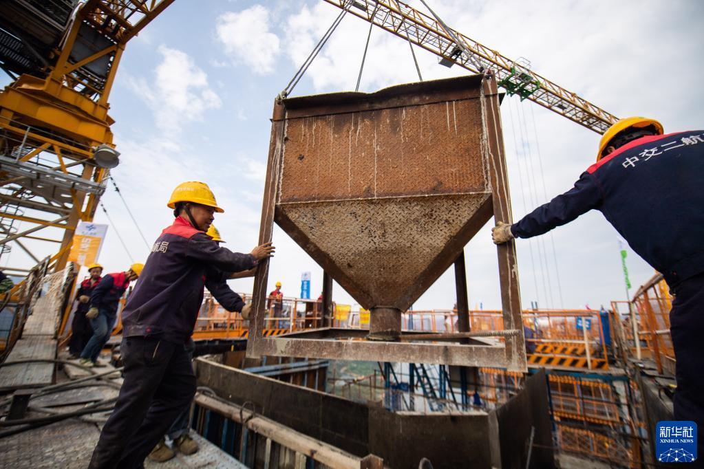 9月20日,在安化縣馬路口資水特大橋施工現場,工人在進行主墩封頂作業。